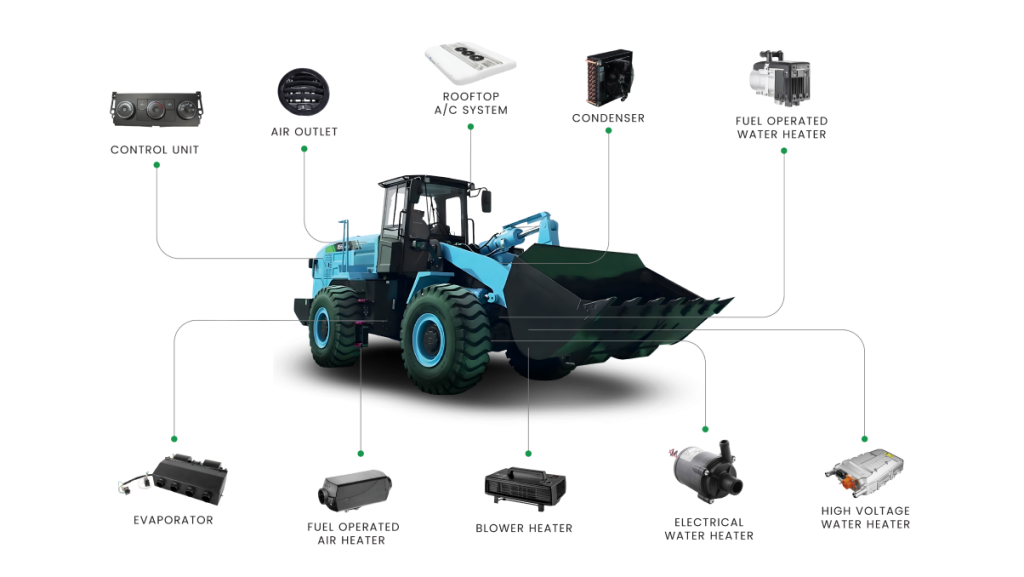 Our driver’s cab air conditioning solutions ensure the essential comfort to keep machine operators alert and safe throughout the year. Additionally, our pre-heaters can be employed to warm engines and cabs during the winter months
