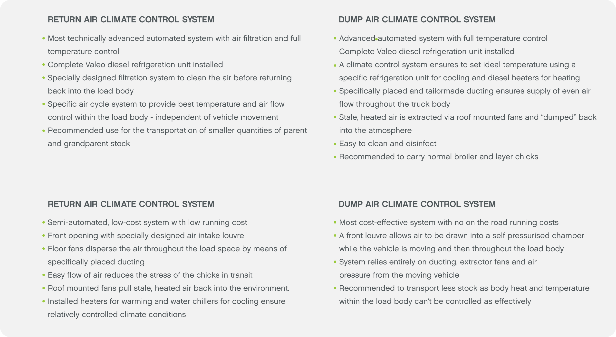 - Equipment inside the chick transportation load body is quickly and easily cleaned and disinfected.