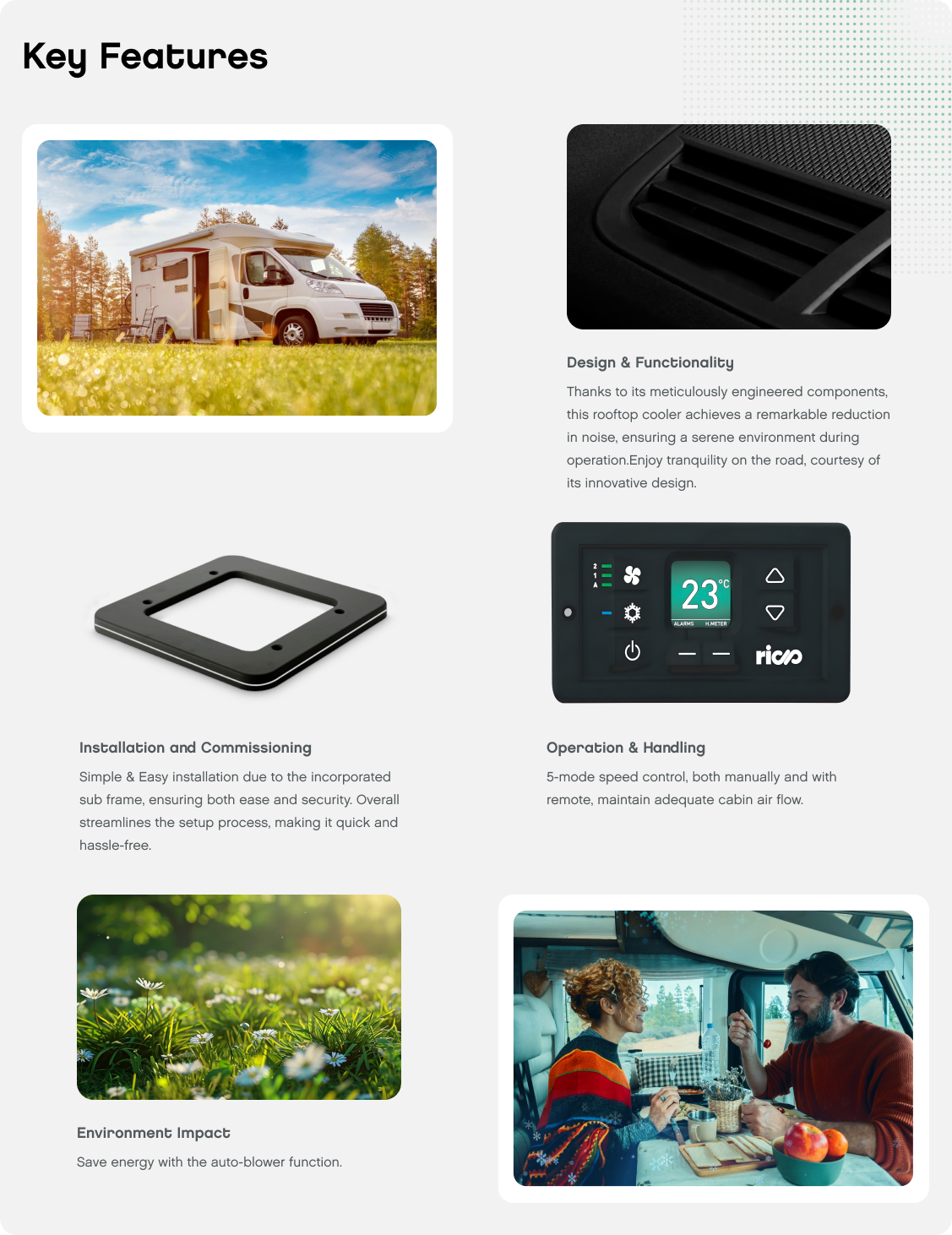 Presenting the newest advancement in truck parking coolers: now offered in a convenient 12V version ideal for panel vans, light trucks, and special vehicles! This compact rooftop cooler boasts 1100W of cooling power, operating quietly while delivering impressive energy efficiency. Enjoy effortless installation and intuitive operation, with four selectable modes: Automatic, Eco-Friendly, Turbo, or User-Controlled, controlled and operated by Rida Electronics. Cooler transport, is safer transport. Improve driver comfort, stay cool and refreshed on the road, in the parking like never before!