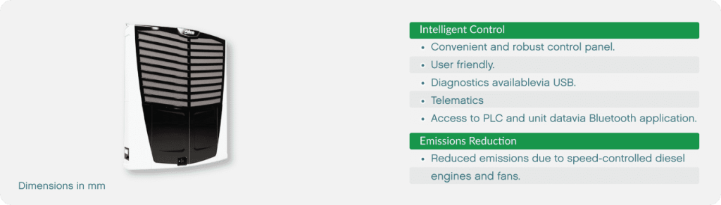The VT180, tailored for insulated trailers, boasts a robust design for challenging conditions. Featuring a speed-controlled diesel engine, variable-speed brush-less condenser and evaporator fans, and an electronic expansion valve, it achieves efficient, low-noise operation based on engine load. Accurate temperature control and even air distribution uphold superior product quality and consistent performance.